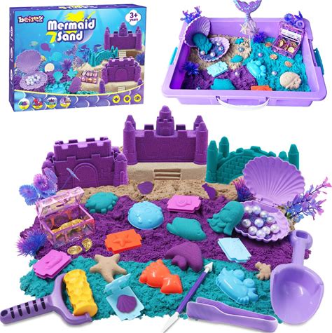 BEIREG Mermaid Sensory Bin Kit - 60Pcs Sensory Sand Set With 2Lbs (Purple/Teal/Beach), 17 Sea Castle & Marine Molds, 12 Tools, Treasure Chest, Ocean
