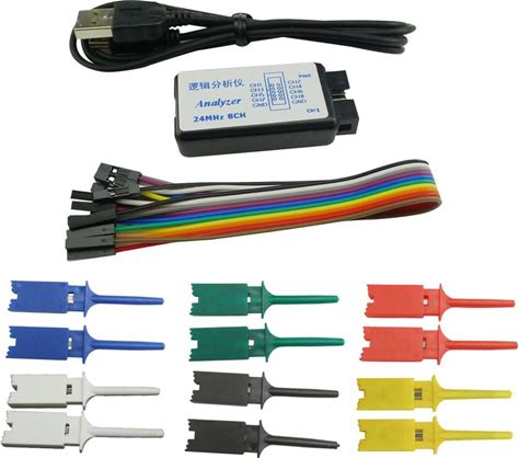 Ferwooh USB Logic Analyzer 24Mhz 8CH 8 Channel UART IIC SPI Debug Device + 12PCS 6 Colourful Test Hook Clip Set + USB Cable + Debugging Tool Sets